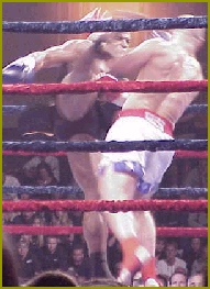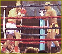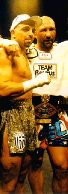 On Friday, May 3, 2002, K-1 Promoter Scott Coker (Left speaking) will host another version of the famous K-1 Tournament at the Mirage Hotel and Casino in Las Vegas to determine who will advance to the next round of the million dollar K-1 championship series. Despite losing 3 of his original selection of fighters (Maurice Smith, Duke Roufus, Thomasz Kucharzewski and karate fighter Basem Balbaki) Cooker is very excited about the final matches since the replacements are sure to add plenty of tournament action and in some cases, even more. The biggest upset to the Tournament this year was the loss of former IKF World Champion Duke Roufus. Roufus had to drop from the event when he suffered an ankle injury during training last week. However the loss of Duke to the Tournament will be Coker's gain in the end. Duke (Right) will now be replaced by his brother and current IKF World Champion Rick "The Jet" Roufus (Left) who will replace Duke in the tournament instead of fighting one of the nights Super Bouts. Rick, like Duke has won multiple World Titles in his career in several different organizations (Rick 6 different ones, Duke 3 different ones) and will be an exciting addition to the Tournament. He is also a former World Boxing Council (WBC) Continental Americas boxing champion.Duke had been named by the Mirage Casino as the second favorite to win the crown at this years May event and it will be interesting to see where Rick falls in the odds when the doors open Saturday night. Many remember last years (May K-1 where McDonald was basically robbed out of the title by the ridiculous half point system. However, if not for the "Phantom Punch Knockdown" he scored thanks to referee Ray Balowitz (Clearly confirmed by the in-house instant replay where Roufus fell back from being off balance from a strike he threw a split second earlier, however referee Balowitz mad a bad call to give Roufus a standing 8 count which cost Roufus the round and possibly the bout as well.) he may have never made it to the final in the first place. Regardless, against Maurice Smith last year, the trophy was looking like it was made for the Young Gun, McDonald, but in the end, the half point system gave a gift to Smith. Many say the trophy this year is McDonalds (Below Left) to win, or possibly lose as well... He's highly favored this time but the question is, "Do the odds makers really know his competition...?" Those in the know, know that his road to the trophy this year may actually be even tougher then last years road. This years tournament has much younger and stronger talent as well as some older talent that has some history with the favored McDonald... History he would rather forget... If Rick Roufus and McDonald meet in the final, this is sure to be the fight everyone will want to see because of some history connecting the two. Several years back on January 22nd, 1994 at Caesars Tahoe Nevada, Rick fought and defeated a much smaller McDonald to win the IKF Full Contact Rules Light Heavyweight World Title. In that bout Rick weighed in at 179 to McDonalds 178. It was over quickly as Roufus knocked McDonald out "COLD" at only 43 seconds of the first round. Roufus later retired the title to move up in weight and into leg kick rules where he later won the IKF International Rules Heavyweight World Title with a 9th round stoppage over Stan Longinidis (Above Right & Right) of Australia in Massachusetts on the infamous Mass Destruction PPV Event. It was Roufus' biggest win of his career but also his greatest disappointment since the promoters never paid him for his bout. With the drop of Duke and the replacement of Rick, you would only expect the fair thing to do would be to put Rick into Duke's open spot in the tournament to face Dewey Cooper as scheduled. However, for some reason the tournament match-ups were reshuffled. Roufus instead will face former IKF Amateur North American and IKF Amateur USA Tournament Champion Kurt Hasley, (Left) of Chattanooga, Tennessee. We last saw Hasley (240, 6'4") when he was making a name for himself at the K-1 Qualifier event in Milwaukee earlier this year. In round 1, Hasley met up with Michael Regnier (210, 6'3") of San Francisco, California USA and quickly overpowered him and exploded with several jab and right hand combinations that sent Regnier to the canvas at 2:17 of the first round. In his second bout Hasley met Andre Walker which proved to be a match where experience over-ruled the muscle. In the bout the action was calm until round 2 where Hasley came out as if there was no tomorrow landing some great explosive hand combinations on Walker. When the bell rang, Walker must have been ringin as well because Hasley connected on several clean shots to his head. When the round was over, Walker's corner informed the referee that he was done giving Hasley the win. In the final round he met DeNatale who will also be in Las Vegas. For the result of that bout, see below... In McDonald's first round match-up though, he will have a much tougher time than many might think. He will face off against who we have selected as the dark horse of the tournament...Giuseppe DeNatale (Left) of Winnipeg, Manitoba Canada. On February 9th of this year, DeNatale brought the legend of Rocky to reality as he came back not once but twice from what looked like sure defeat. In his opening round of the Milwaukee K-1 Qualifier Tournament, DeNatale dropped opponent Mark Miller about a minute into the opening round with a head kick and later exploding with a left - right combination that put Miller down for good at 2:07. In his round 2 bout, a 250 lb tree stood in the middle of his road to the final named Carter Williams, (Right, first alternate at this weekends K-1 - to be used in case someone drops out) who out-weighed him by 32 lbs (218 - 250) It was David Vs Goliath and as in the story told many times, DeNatale held on to win by a very questionable K-1, 2 knockdown rule call when DeNatale knocked Williams into the rope