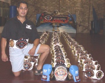 Our IKF/IAA VP of awards and merchandise Frank Curtis (Right) specializes in the perfection of each of these belts. Frank and his staff hand paint each and every medallion followed by clear coating so the brass won't dull over time as in past IKF Belts. No fast assemble line cut and paste here. Compared to the other generic championship belts, it would take 4 of them to equal the weight in one of these.