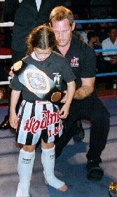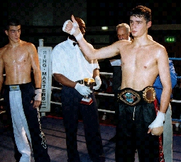 IKF AMATUER LADIES FEATHERWEIGHT ENGLAND INTERNATIONAL RULES. LOUISE BURNETT- Hope Kicboxing V LISA HOBON- Kirkby Thai boxing. This bout was won by BURNETT BY DEFAULT as her opponent, LISA HOBON FAILED TO SHOW. Louise was very disappointed obtain the title in this way as she had trained very hard and was up for the bout. First on after the interval, JAMES QUIRK, Merseyside Kickboxing Vs ROBERT HORTON, St Helens Martial arts. QUIRK took the first round, looking confident. In second HORTON started to find his range. The third saw QUIRK clowning, but HORTON stuck to his task, and took the decision. The penultimate bout was the IKF Junior Amateur European Middleweight Title, between BRUNO SUSANO, of Portugal and ALEXANDROUS DIMITROU, of Greece. The bout was refereed by Mike Fowles European Co-Coordinator And International Referee. The fight was a non stop seven round war, with neither fighter willing to take a backward step. SUSANO'S strong body kicks and sharper hands swayed the judges. The New Champion - Bruno Susano of Portugal. Top of the bill, the IKF World Junior Amateur Lightweight Full Contact Title. Paul Middlehurst, of Merseyside kickboxing v Tiago Mendes of Portugal. The atmosphere was electric as both fighters entered the ring. The crowd stood in respectful silence as the national anthems were played. At the bell, Middlehurst took the fight to Mendes, giving him nowhere to hide. A strong body kick sent Mendes into the corner, Middlehurst took fulladvantage of his opportunity following up with solid body punches. Mendes dropped to the canvas, unable to beat the count. The NEW WORLD CHAMPION - PAUL MIDDLEHURST, of ENGLAND.