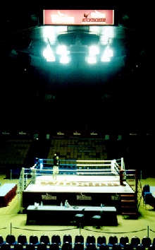 Using different accents in almost every interview, Marinoble was clever, witty, crazy... well lets face it, ever wonder why they call him "The Madman...?" well, we all found out... On the other side of the spotlight was Kimber who still made everyone laugh, but in a more serious tone of humor. The two worked so well together many thought they had known each other for life. However the fact was, they had met for the first time in Los Angeles Airport on Sunday, only a few days before. When asked things like "So, do you think he (Opponent) will be tough competition?" They would respond with lines like, "Well, I hear he dances well..." Or when asked, "Do you think the fight will end early?" One would reply, "Well I don't know about him but I'm packing a lunch because I heard he's pretty tough and I plan on a long nights work." It was lines like these that brought smiles and laughs to those in attendance. Neither cut the other down once. NOT ONCE! In fact, they both had tremendous respect for each other which made them seem like larger than life heroes to not just those in Malaysia, but to the entire IKF Team as well. It was their actions out of the ring that made the stage for one of the Greatest World Title Bouts to come. The day before the weigh-ins, IKF Officials Brooks Mason and Chuck Wolfe went with Andre Thomas to Shah Alam Stadium to help set up the ring and did a great job as well. It was a bran new TWINS Products Ring. Without a doubt, it was the nicest ring we've ever seen around the world. On Friday morning, they went back to finish it up. Later in the day, both fighters were asked if they wanted to go to the arena and get a feel of the ring. While Kimber opted not to, Marinoble took advantage of it. In a stadium that can hold over 10,000, Marinoble checked the ring alone and was dwarfed by the size of the arena. (Right) The event weigh-ins were on Friday night before the scheduled Saturday night bout. Marinoble made sure to grab the spotlight at the weigh-ins when he had trainer Greg Kirkpatrick place a radio inside the conference room where the weigh-ins were to take place. When he was announced to the crowd for his entree, someone pushed the "PLAY" button and Marinoble entered to the tune of "Cowboy" by Kid Rock, struttin in like "The Prince" himself with open shirt and sun glasses. A roar and cheer from the crowd relaxed the press and all who wondered if they should make any noise at all. What else would we expect though from someone known as "The Madman..." Marinoble set the tone as relaxed and what could have been expected to be a tense weigh-in, just turned into another good time for everyone. On the other side of the room, upon being introduced, current Champion Kimber made his entree rather quiet, but professional. With his shirt off showing the Malaysia media what a lot of hard work and 2% body fat looks like. With dozens of cameras flashing and clicking at both fighters, each took their turn at different poses for the media and even shared a few laughs
