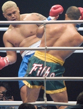 When opportunity knocks, Mark Hunt knocks back, knocks down and knocks out. Hunt won the K-1 Oceania with three knock outs then got eliminated in the Melbourne GP by Ernesto Hoost. He didn't even qualify for the Fukuoka Repechage tournament, but when Filipovic withdrew he got a chance. There he lost to Ray Sefo who was unable to continue and opportunity knocked for the last time. He clobbered Adam Watt to qualify for the Grand Prix and hasn't looked back since. Grand Prix wins over Jerome LeBanner, Stefan Leko and Francisco Filho mean that Mark Hunt is not only a K-1 superstar but also the first new champion since 1997. He joins Branko Cikatic (1993), Peter Aerts (1994, 1995, 1998), Andy Hug (1996) and Ernesto Hoost (1997, 1999, 2000) to become the fifth kickboxer to win the K-1 Grand Prix Tournament. Here's the bout by bout recap; Ernesto Hoost vs.