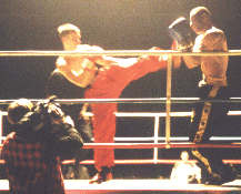 IKF Milwaukee, WI, USA In Milwaukee, America's colosseum of kickboxing, onlookers deem him as "Gladiator." Jason "Gladiator"Johnson (Right in photo) continued his reign of triumph before a sold-out crowd with a stunning win over Kansas City's Jeff "Big Diesel" Ford (L). Both Johnson and Ford have been touted as top American prospects, but tonight Johnson proved to be superior in a dramatic fashion. The first round was punctuated by Johnson landing an impressive head kick, which dropped the ever-formidable Ford. Ford beat the standing eight count and continued to fight back, but Johnson's knee attacks and kicks prevented Ford from establishing a consistent offense. Ford was valiant throughout the bout, but Johnson remained relentless, methodical. The bout was rightfully ended in the third round by referee Al Wichers ; Johnson was landing numerous kicks, punches, and knees on a seemingly unresponsive Ford. Below are the results from the action-packed undercard. Thanks to the sponsors and great fans for making this yet another spectacular "kaboom-kabap" evening of kickboxing! Don't miss Rumble in the Rave II, set for Saturday, March 24, 2001! Be sure to check the IKF News page or www.milwkick.com for more information. |