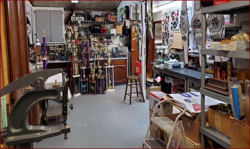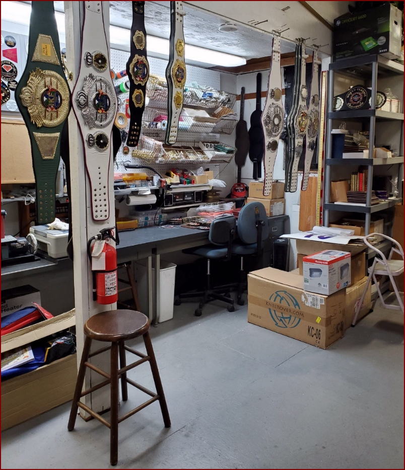Title Belts, Trophies, Plaques, Medals you name it, this room is the production room for International Fight Belts creating awards for Fight Sports as well as all kinds of other events.