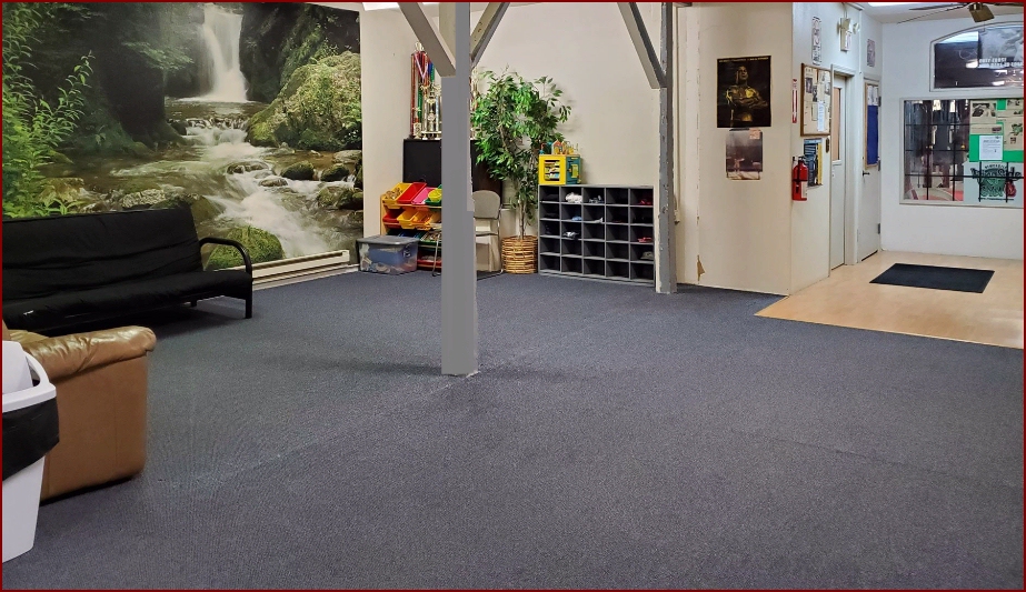 The entire lobby area is over 800 square feet in size. From the lobby, one can view the kickboxing and boxing classes at Ringside Gym through the viewing window on one end or watch the Martial Arts classes through the large glass viewing windows (6' x 20') on the other end.
